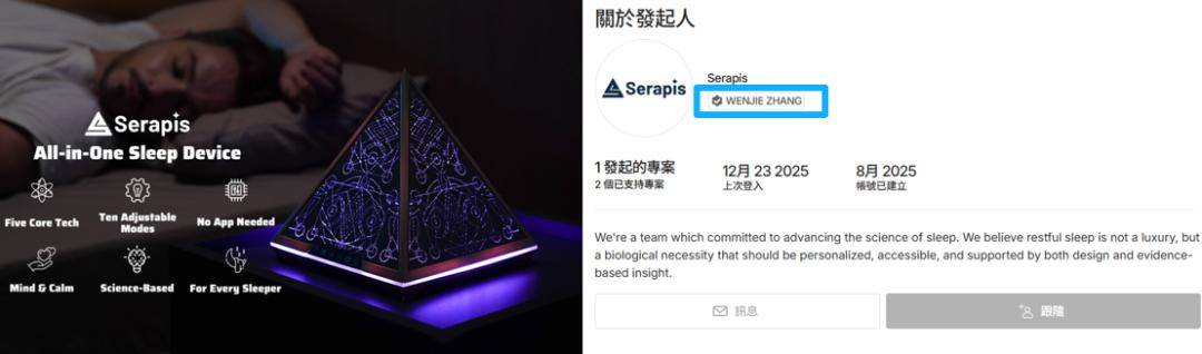 Serapis 的助眠金字塔,同样以变光设计为核心,不过更加温和。官方宣传显示,Serapis 通过 8–12秒的周期性呼吸光和 7 种色温变化,辅助用户调节作息和刺激褪黑素分泌,以实现深度放松,减少用户夜间惊醒。从 Serapis 的发起人信息来看,或为出海团队。