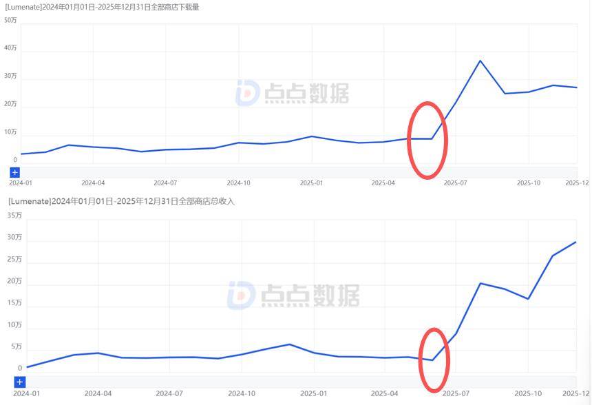 Lumenate 同期下载量(左)、月流水(右)|图源点点数据