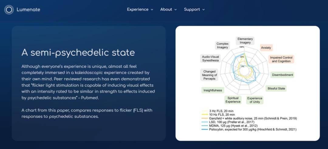 官网引例显示其“闪烁的光刺激能够引发与迷幻物质效果相当的视觉体验”|图源 Lumenate
