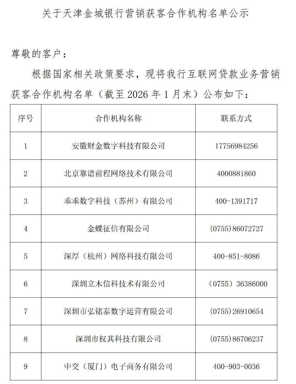 2月5日,天津金城银行股份有限公司(下称“金城银行”)官网发布营销获客合作机构名单(截至1月末),共有9家公司。