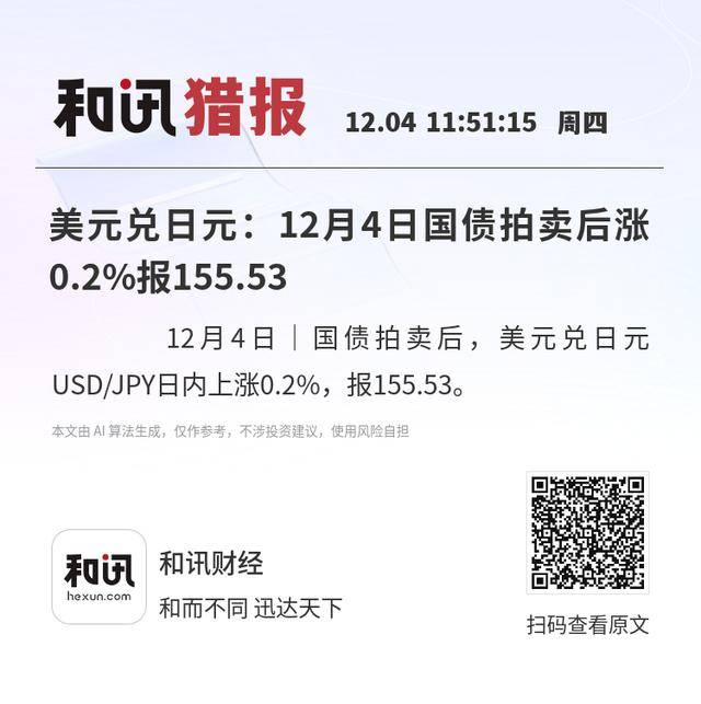 12月4日|国债拍卖后,美元兑日元USD/JPY日内上涨0.2%,报155.53。