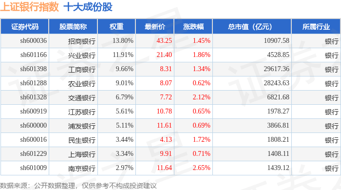 上证银行(000134)指数十大成份股详情如下: