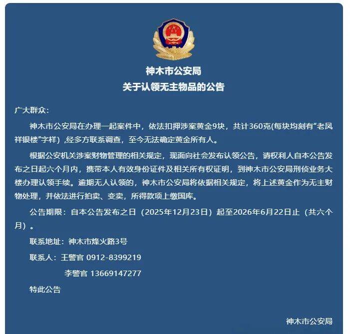 12月23日,陕西省神木市公安局发布“关于认领无主物品的公告”:神木市公安局在办理一起案件中,依法扣押涉案黄金9块,共计360克(每块均刻有“老凤祥银楼”字样),经多方联系调查,至今无法确定黄金所有人。