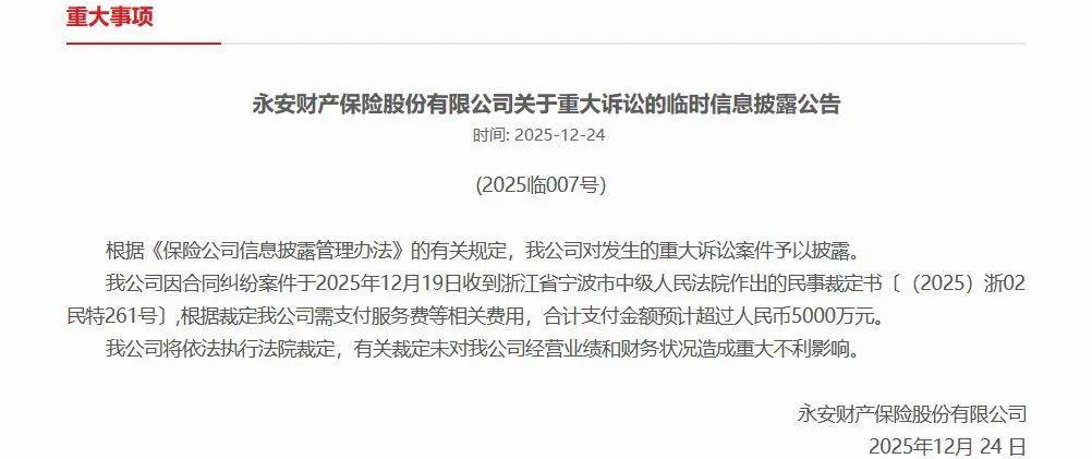 2025年12月24日,永安财险发布公告,披露其在一桩合同纠纷中的关键进展——公司于12月19日收到浙江省宁波市中级人民法院(2025)浙02民特261号民事裁定书,需向对方支付超5000万元的服务费及相关费用。