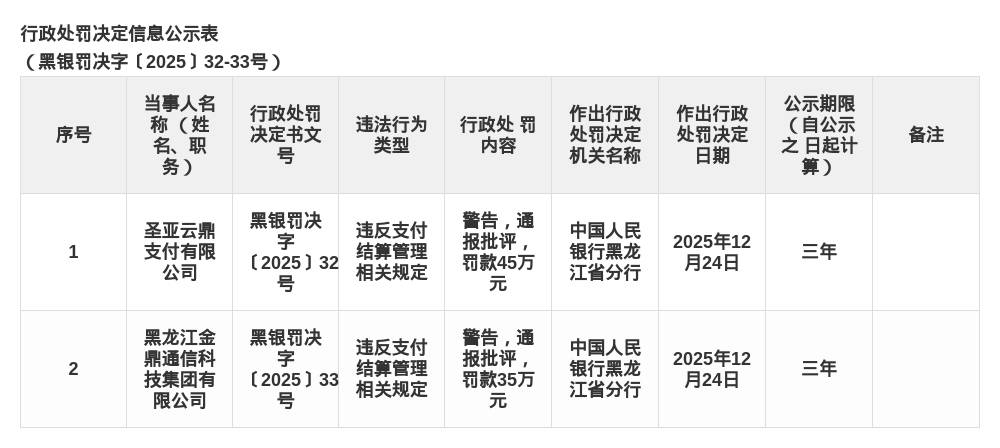 蓝鲸新闻1月4日讯,近日,中国人民银行黑龙江省分行发布了罚单,剑指圣亚云鼎支付有限公司和黑龙江金鼎通信科技集团有限公司。