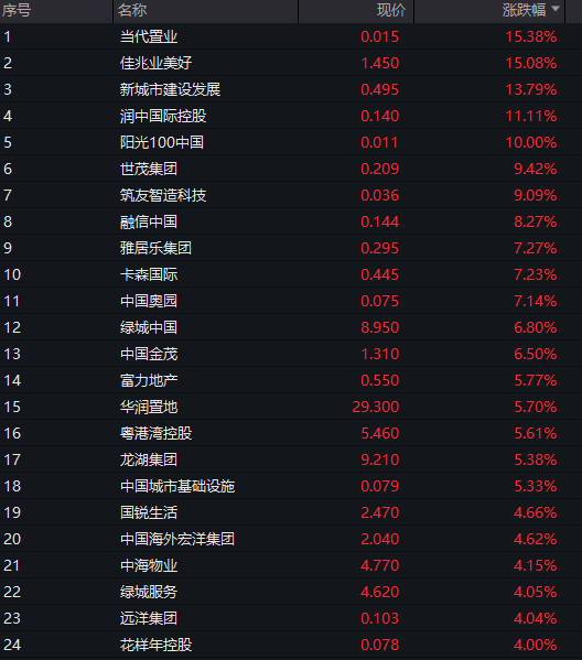 内房股走强,当代置业、佳兆业美好、新城市建设发展等涨幅居前,世茂集团涨超9%。