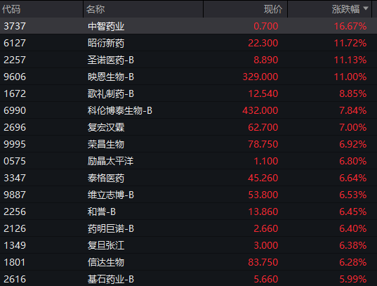 生物医药股涨幅居前,恒生生物科技指数大涨超4%,中智药业、昭衍新药、圣诺医药涨超11%。