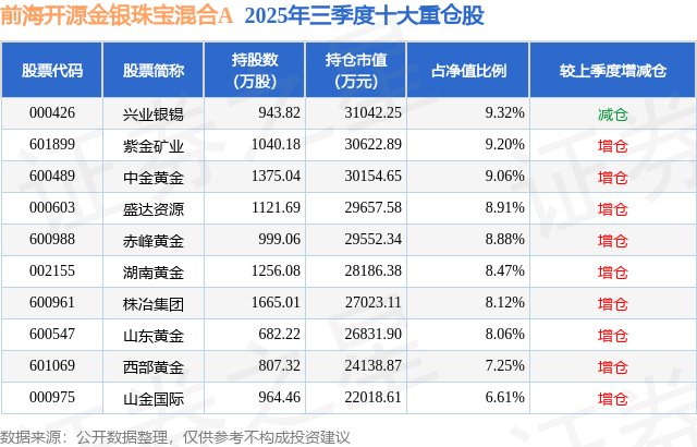 根据2025基金Q3季报公募基金重仓股数据,重仓该股的公募基金共8家,其中持有数量最多的公募基金为前海开源基金的前海开源金银珠宝混合A。前海开源金银珠宝混合A目前规模为6.83亿元,最新净值2.556(12月31日),较上一交易日下跌0.35%,近一年上涨86.84%。该公募基金现任基金经理为吴国清。吴国清在任的基金产品包括:前海开源沪港深核心资源混合A,管理时间为2016年10月17日至今,期间收益率为379.8%;前海开源一带一路混合A,管理时间为2019年7月19日至今,期间收益率为-24.1%;前海开源沪港深农业混合A,管理时间为2020年7月20日至今,期间收益率为-29.43%;