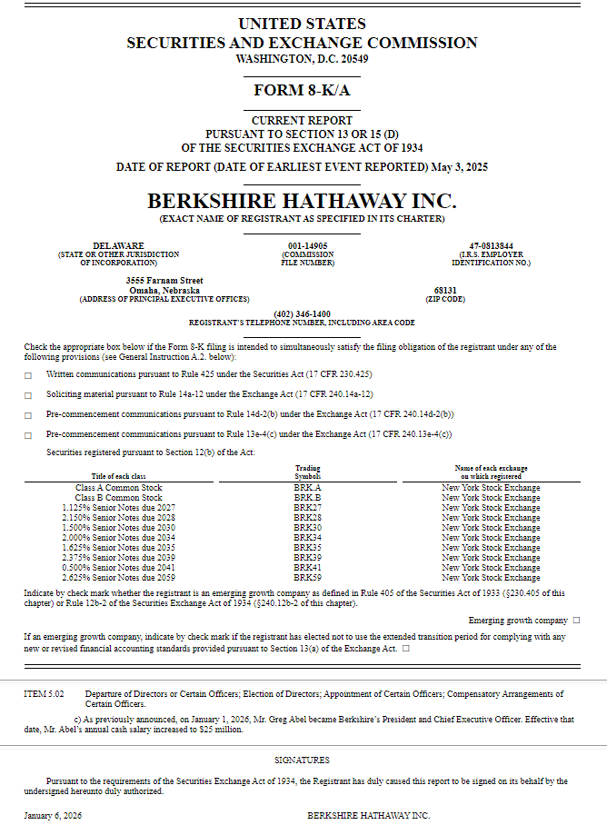根据周二提交给美国证券交易委员会的文件,伯克希尔哈撒韦公司新任首席执行长格雷格•阿贝尔(Greg Abel)接替传奇投资者沃伦•巴菲特后,薪水将大幅增加。