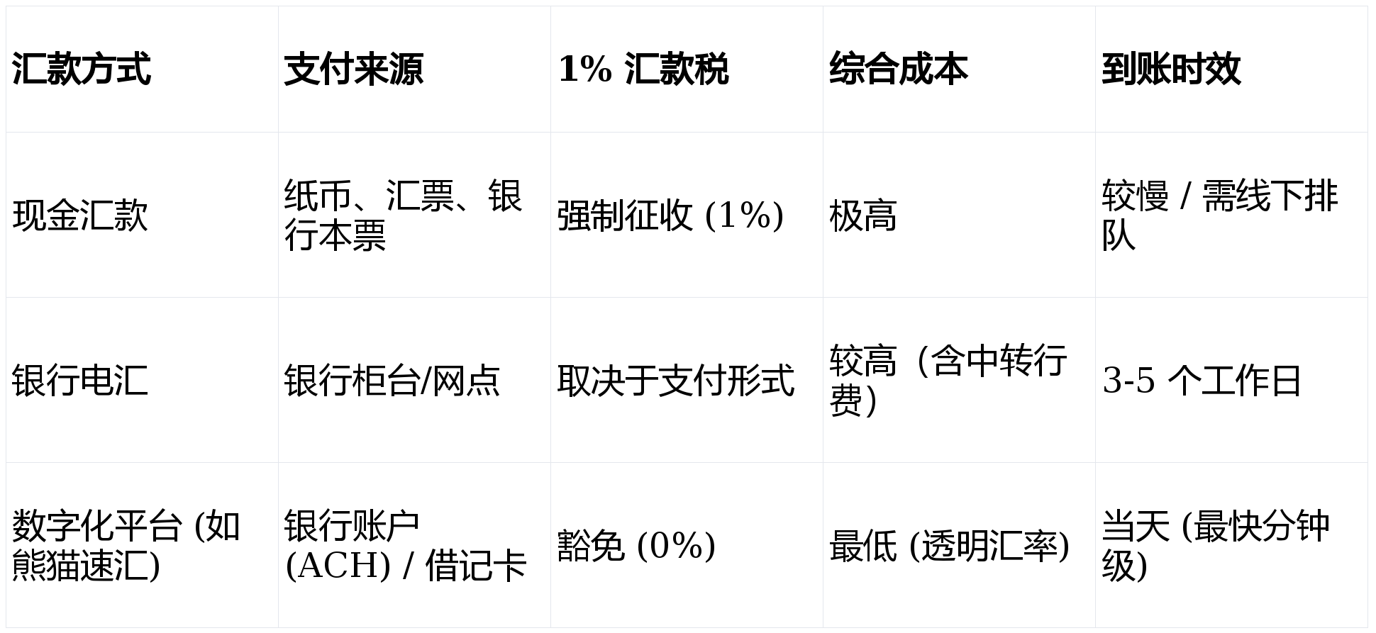 法律明确规定,凡通过现金、汇票(Money Order)或银行本票办理的跨境汇款,服务商必须代扣 1% 税款;与此同时,现金路径缺乏透明的电子存证,在税务监管日益严格的环境下,难以满足长期的合规要求。