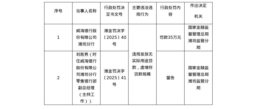 针对上述违法违规行为,国家金融监督管理总局潍坊监管分局对其罚款35万元;对时任威海银行股份有限公司潍坊分行零售银行部副总经理(主持工作)的刘胜男,给予警告。