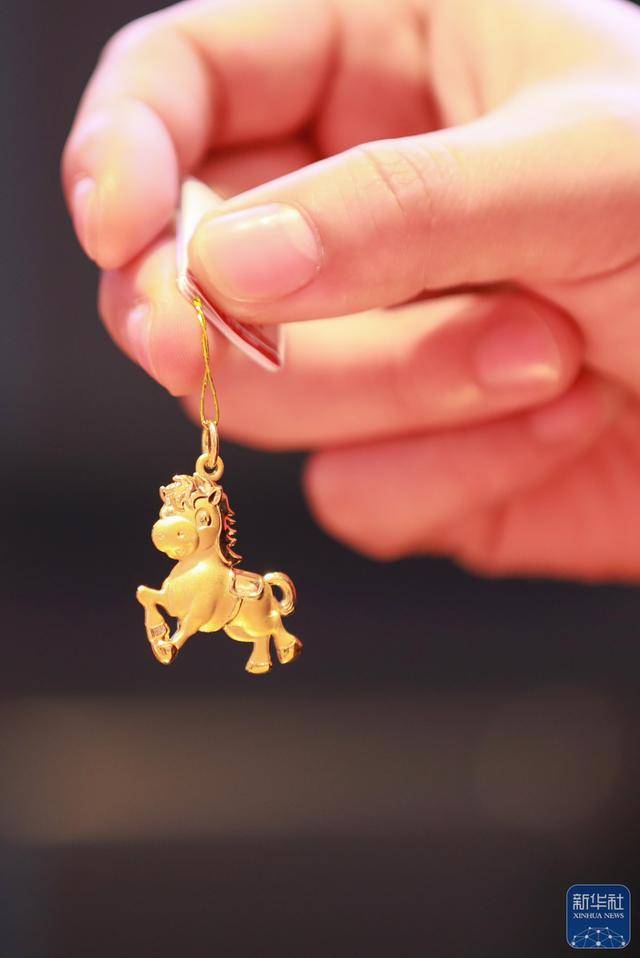 ↑ 1月16日,在贵州省黔东南苗族侗族自治州从江县一家黄金店,店员在展示生肖马主题的黄金饰品。新华社发(罗京来摄)