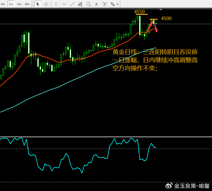 昨日国际金价日线收阴,早盘破高到4500美元关口后一路调整下跌,昨晚全天做空高空调整下跌方向操作为主,一直持续到晚间金价最低下跌到4423美元,且跌破了前一日上涨的起涨点低点4427,昨日早盘也是通知本周本轮上涨已经是进入末端时间和价格,即便是再次继续上涨幅度空间也会非常小,随时冲高砸盘下跌走调整,当然这仅仅一定只是技术性冲高调整,消息面助推金价大涨后整理,今年大周期趋势方向依然主多不会有太大变动;无论是整个趋势上涨形态,还是地缘局势和整个经济环境影响,中长期走势多头上涨不会有太大变动;也就是目前没有任何信号看好空头大幅调整下跌,调整下跌,哪怕是单日大跌100-200美元,且连续下跌3个交易日,也一定是涨幅过多过大正常的调整,没有其他原因,调整结束后依然回到正常上涨趋势通道;