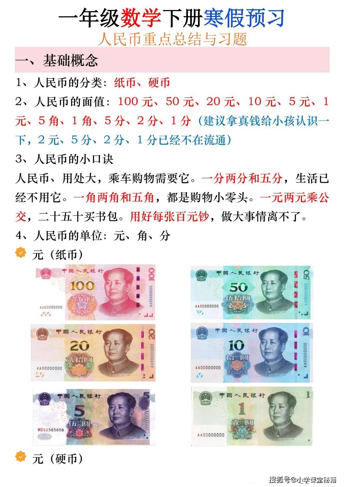 对一年级学生来说,这份资料不仅能让他们掌握人民币的基础知识,更能为后续的购物计算、金钱管理打下基础。通过实物图片、口诀记忆与练习巩固,学生可以逐步建立对货币的认知,提升生活中的数学应用能力。