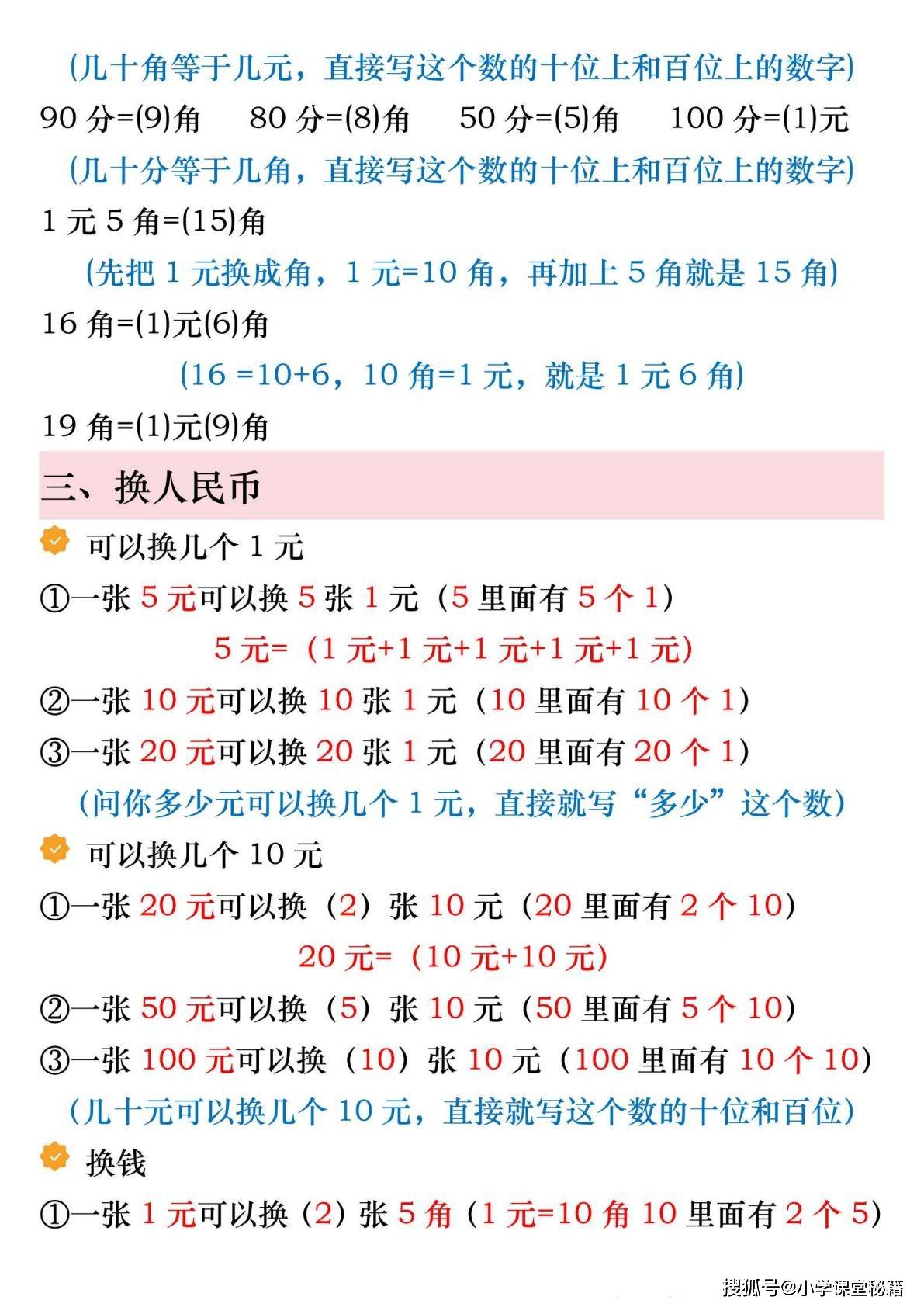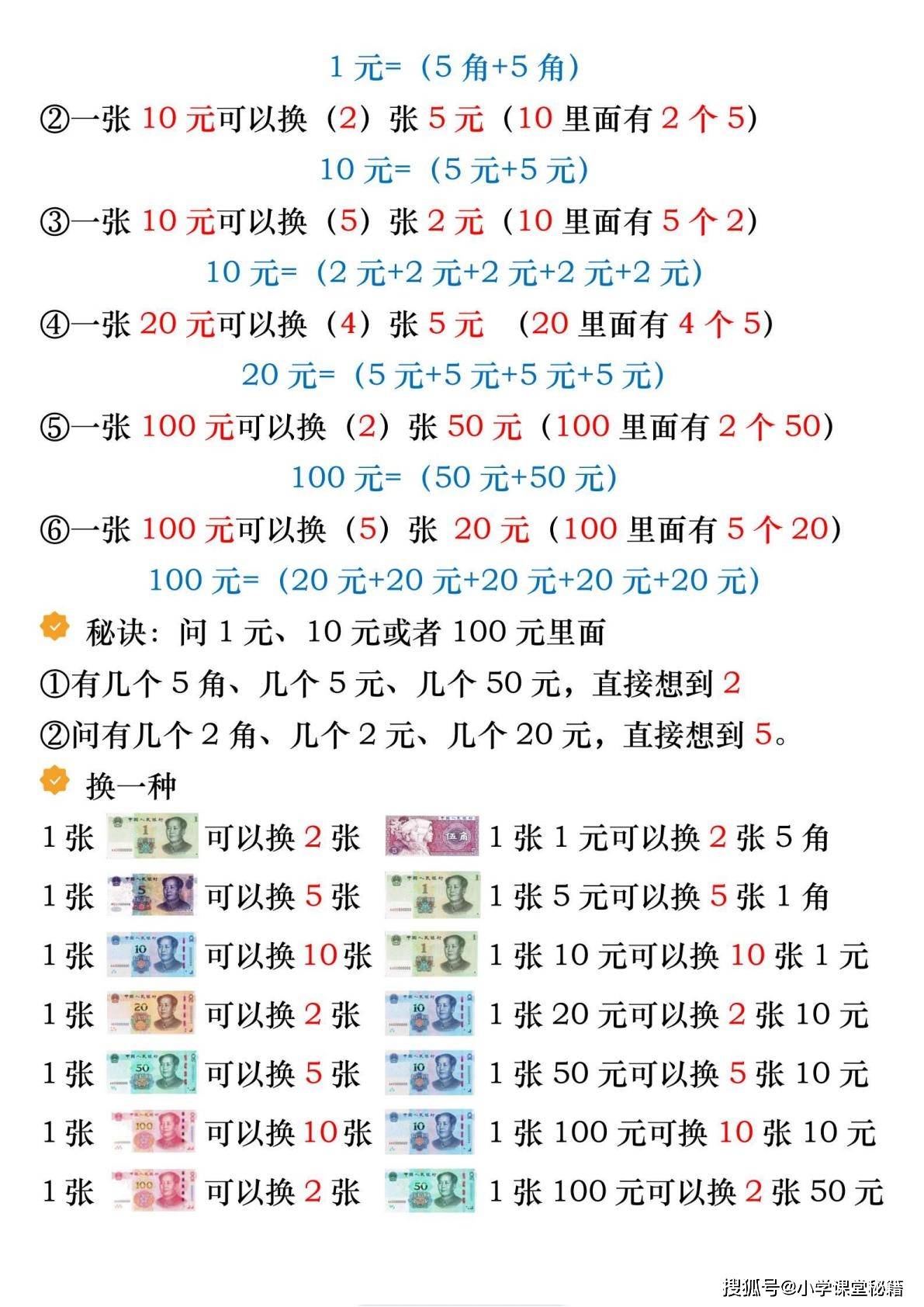 资料还总结了换币秘诀:问 1 元、10 元或 100 元里有几个 5 角、5 元、50 元,直接想到 2;问有几个 2 角、2 元、20 元,直接想到 5。这能帮助学生快速解决换币问题。
