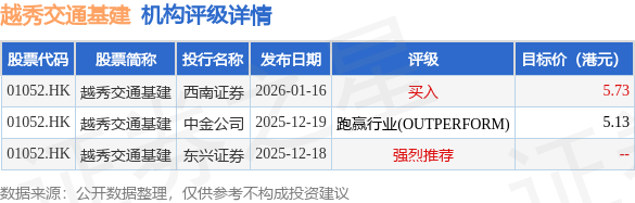 截至2026年1月23日收盘,越秀交通基建(01052.HK)报收于4.62港元,与上一交易日持平,成交量38.2万股,成交额175.63万港元。投行对该股的评级以跑赢行业(OUTPERFORM)为主,近90天内共有1家投行给出跑赢行业(OUTPERFORM)评级,近90天的目标均价为5.43港元。西南证券最新一份研报给予越秀交通基建买入评级,目标价5.73港元。