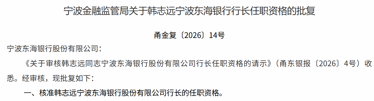 1月20日,宁波金融监管局发布任职批复,核准韩志远宁波东海银行股份有限公司(下称“东海银行”)行长的任职资格。