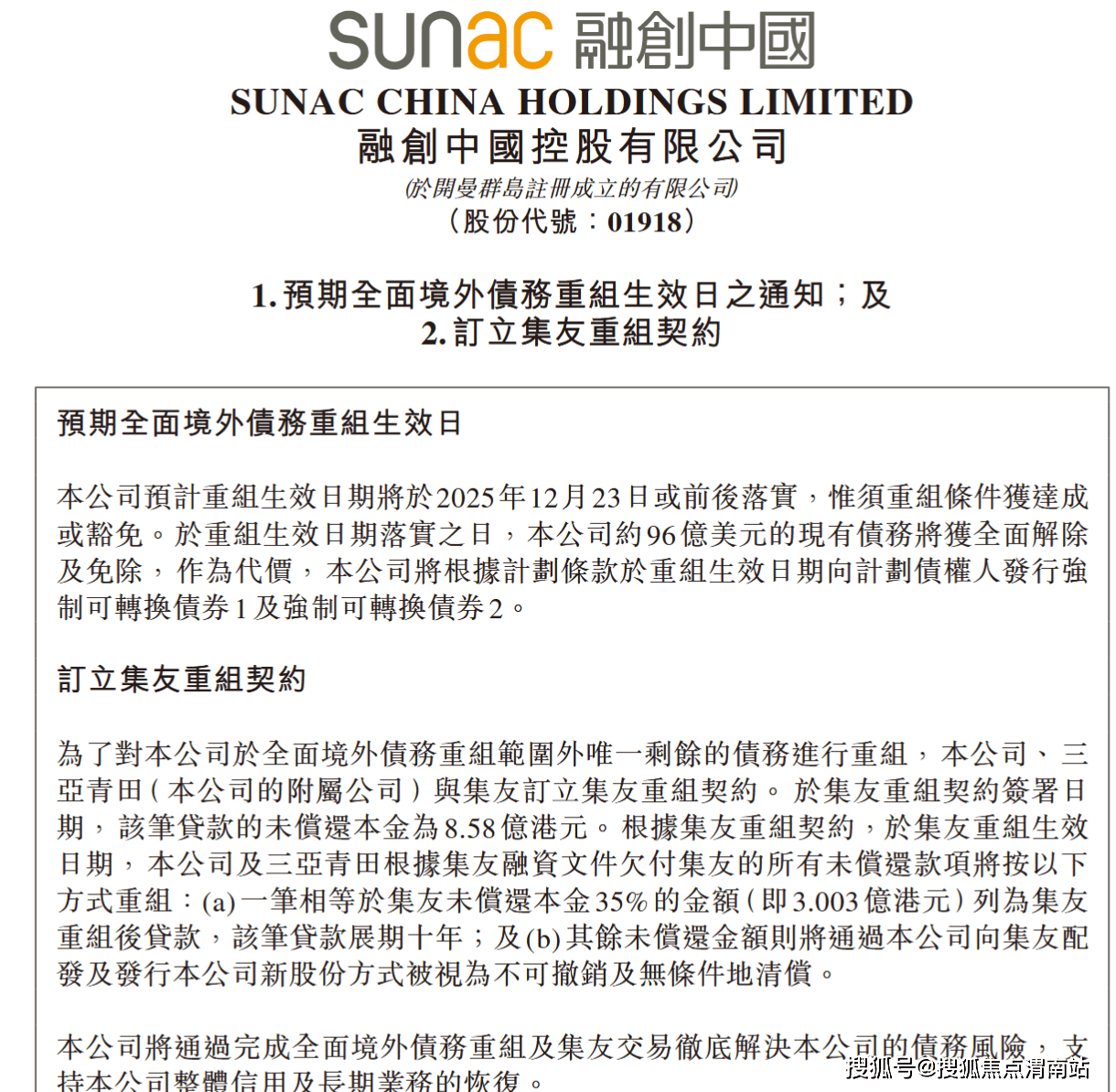 中房网讯(刘敏/文)12月17日,融创中国公告称,公司预计重组生效日期将于2025年12月23日或前后落实,惟须重组条件获达成或豁免。