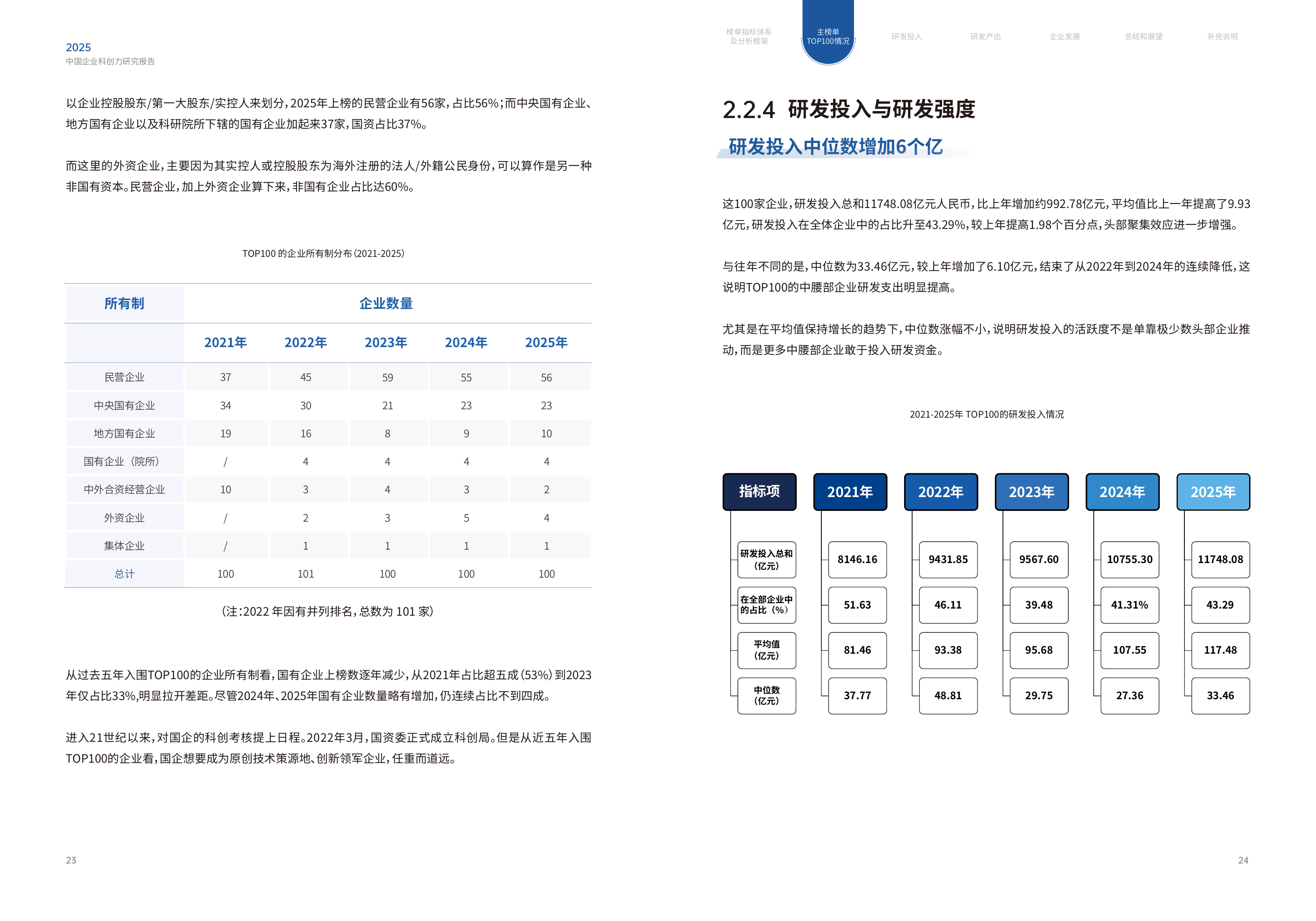 在研发投入方面,数据显示多数企业持续增加研发支出,且TOP100企业表现出显著的增长趋势。研发投入强度和研发人员数量成为衡量企业创新能力的重要指标。不同行业和区域的企业在研发投入上存在差异,部分领域如医药、信息技术等表现突出。