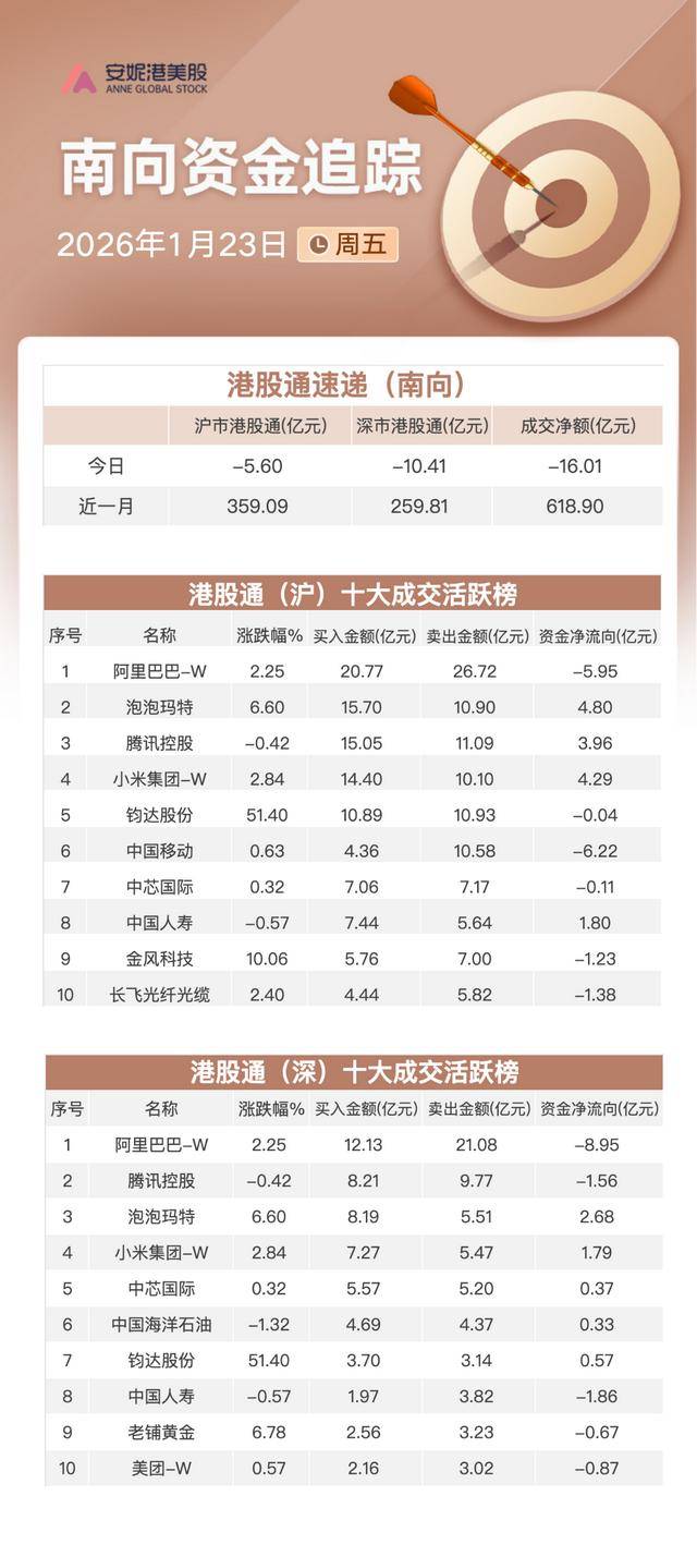 周五,南向资金净流出约16.01亿港元,其中沪港股通净流出约5.6亿港元,深港股通净流出约10.41亿港元。