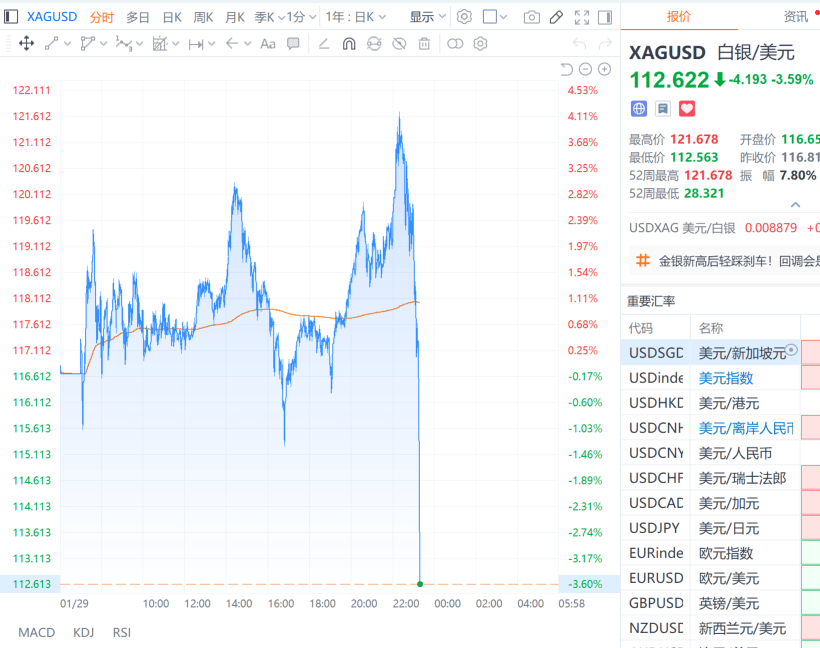 现货白银日内跌幅扩大至8%,报107美元/盎司。现货钯金跌破2000美元/盎司,日内跌4.7%。