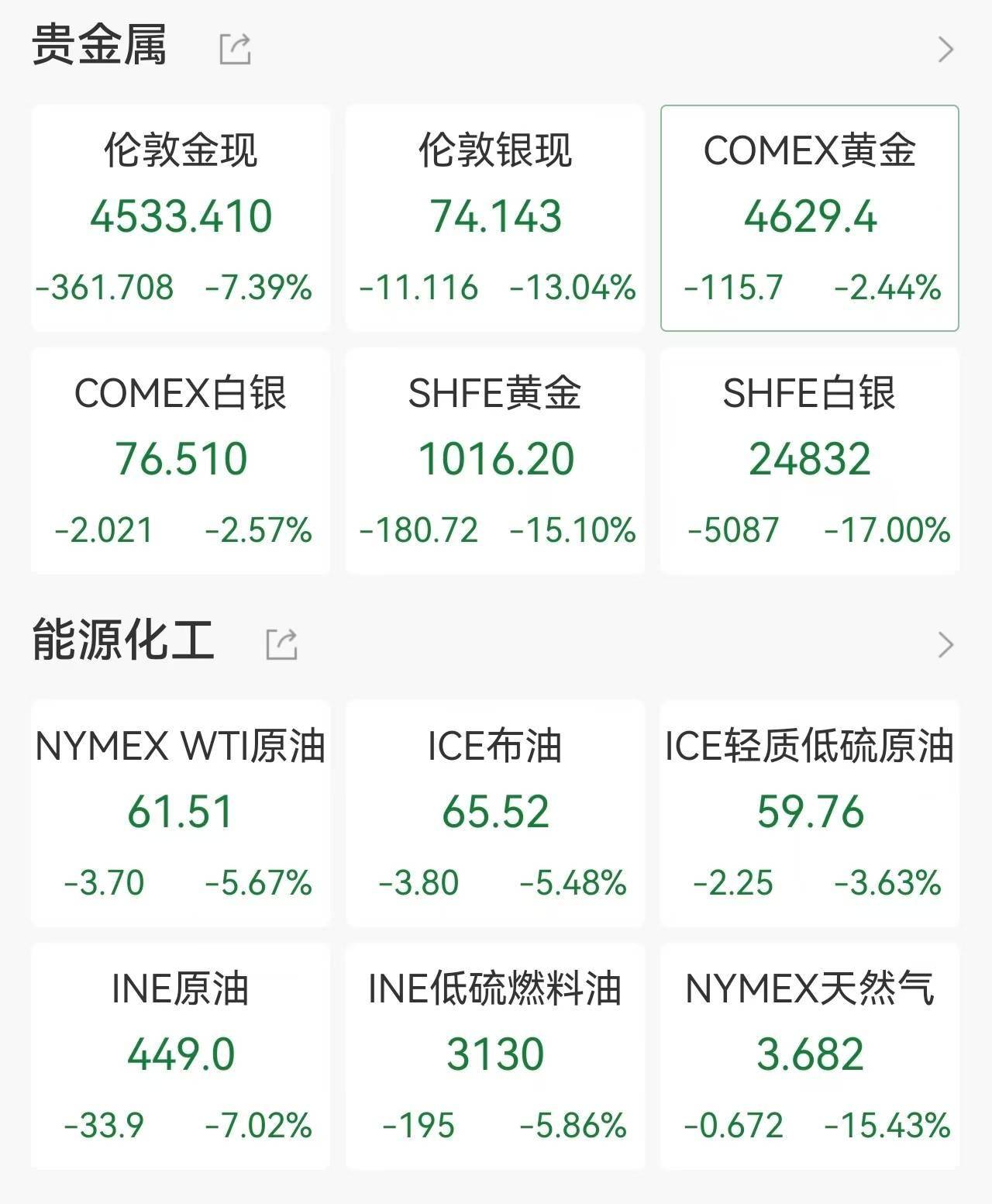 现货黄金日内跌幅扩大至7%,报4533.41美元/盎司。现货白银跌幅扩大至13%,报73.143美元/盎司。
