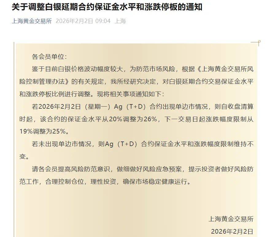 若2026年2月2日(星期一)Ag(T+D)合约出现单边市情况,则自收盘清算时起,该合约的保证金水平从20%调整为26%,下一交易日起涨跌幅度限制从19%调整为25%。
