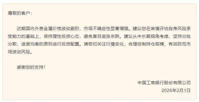 2月1日,中国工商银行发布消息称,近期国内外贵金属价格波动剧烈,市场不确定性显著增强。建议投资者在审慎评估自身风险承受能力的基础上,保持理性投资心态,避免盲目追涨杀跌。建议从中长期视角考虑,坚持分批分散、适度均衡的原则进行投资配置。请投资者密切关注行情变化,合理控制持仓规模,有效防范市场波动风险。