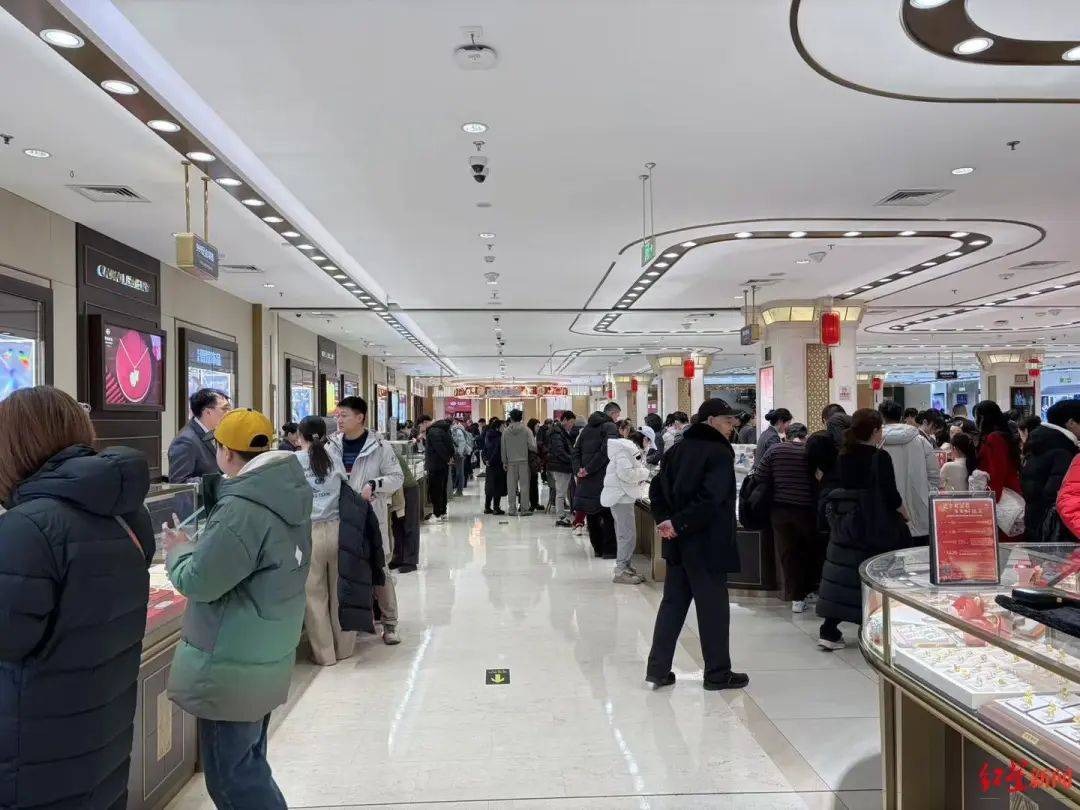 菜百首饰商场的一层主要是金饰品销售。2月1日中午,记者来到这里时,销售区域内挤满了看黄金和购买黄金饰品的人,有些人还拖着行李箱,而工作人员在柜台后不停忙碌。
