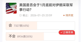 和资产预判看涨情绪的“翻车”不同,在三大国际事件的判断上,多数用户拿捏到位。面对中东紧张局势,55%的用户跳出情绪干扰,冷静判断美国不会在 1 月底前采取军事行动。