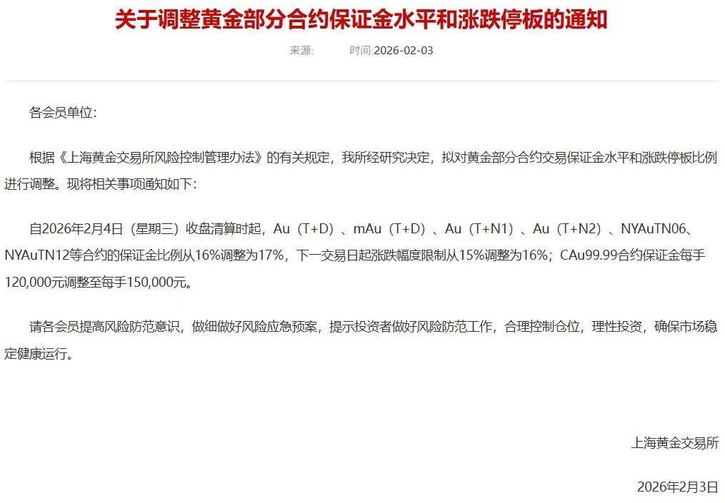 自2026年2月4日(星期三)收盘清算时起,Au(T+D)、mAu(T+D)、Au(T+N1)、Au(T+N2)、NYAuTN06、NYAuTN12等合约的保证金比例从16%调整为17%,下一交易日起涨跌幅度限制从15%调整为16%;CAu99.99合约保证金每手120,000元调整至每手150,000元。