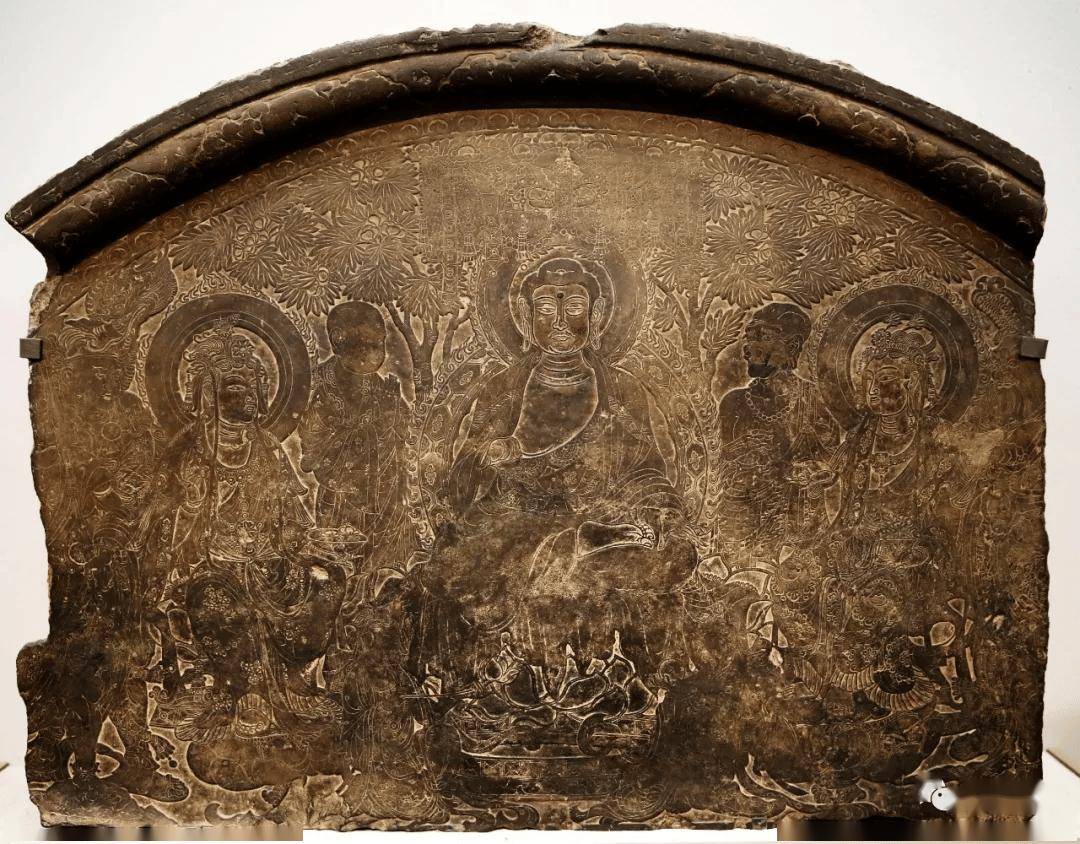 画面整体呈拱形,左右有缺失,采用线刻和减地线刻手法,描绘了一佛,二弟子,二菩萨,二力士一铺九身画面组合,