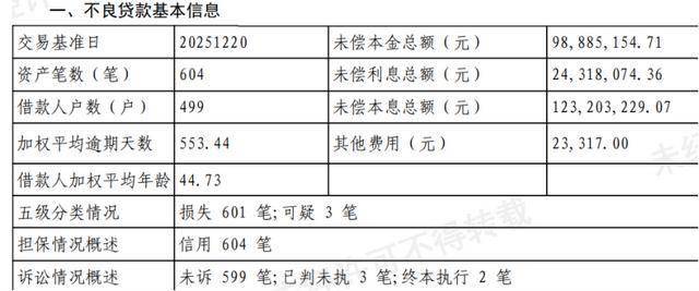 内容披露,该笔资产包未偿本金总额9888.51万元,未偿利息总额2431.81万元,未偿本息总额1.23亿元。