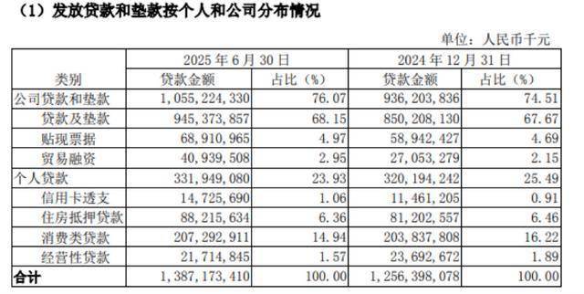 截至2025年上半年,该行个人贷款余额3319.49亿元,较上年末增加117.55亿元,增幅3.67%。其中,消费类贷款2072.92亿元,占个人贷款总额超62%,而信用卡透支147.25亿元,占比仅为4.43%。