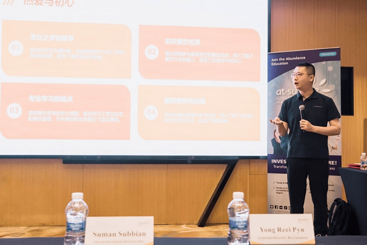 接着,三位优秀校友分享了他们在 At-Sunrice 的学习与成长经历。“在这里,我不仅学到了精湛的烹饪技艺,更让我理解了多元文化的餐饮创新。” 一位校友感慨道。而一位奖学金获得者,则从自身经历出发,讲述荣获 “ 奖学金” 的激励作用,分享留学规划与奖学金申请经验,透露未来在餐饮创业领域的发展目标,鼓励更多中国学子把握海外深造机遇。