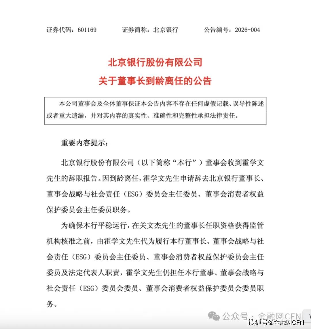 北京银行表示,为确保该行平稳运行,在关文杰的董事长任职资格获得监管机构核准之前,由霍学文代为履行该行董事长、董事会战略与社会责任(ESG)委员会主任委员、董事会消费者权益保护委员会主任委员及法定代表人职责,霍学文仍担任该行董事、董事会战略与社会责任(ESG)委员会委员、董事会消费者权益保护委员会委员职务。据悉,因到龄离任,霍学文已申请辞去北京银行董事长、董事会战略与社会责任(ESG)委员会主任委员、董事会消费者权益保护委员会主任委员职务。