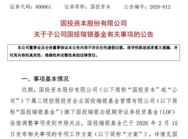 国投资本发布了《关于子公司国投瑞银基金有关事项的公告》,公告称,近期,国投资本下属三级控股投资企业国投瑞银基金旗下国投瑞银白银期货证券投资基金(LOF)估值调整事项受到市场关注,国投瑞银基金已于 2026年2月15日发布相关事项的专项工作方案。