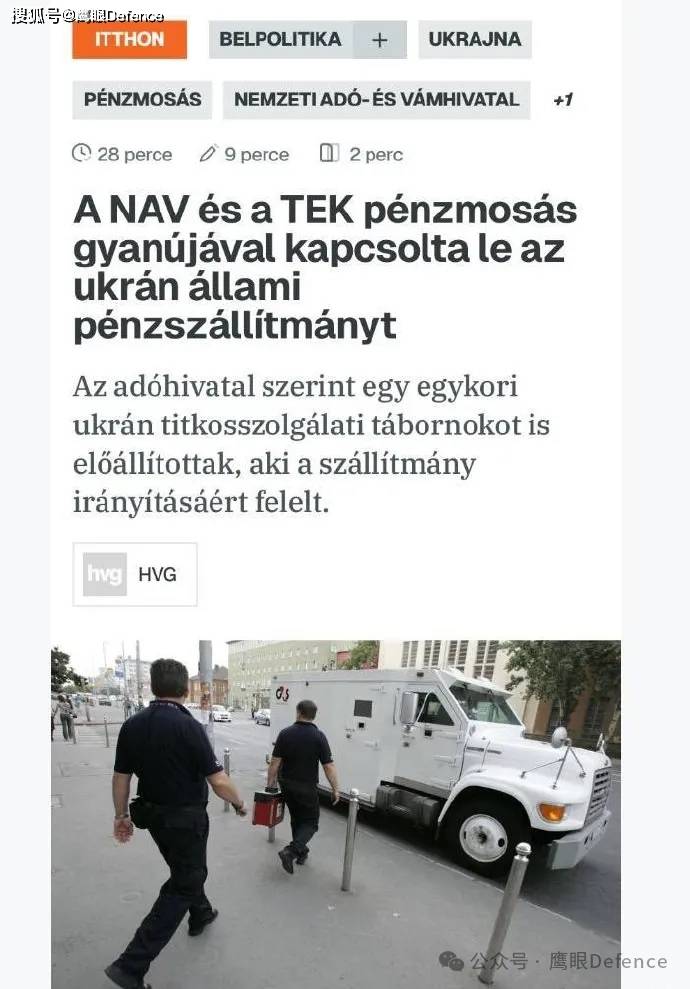 当地时间3月5日,乌克兰国家储蓄银行的两辆装甲运钞车在执行例行的外币和贵金属运输任务时,在匈牙利境内被非法扣押,大约4000万美元、3500万欧元和9千克黄金,连同7名押运员被扣留,GPS信号显示这两辆运钞车被转移到了布达佩斯市中心,靠近匈牙利某执法机构。