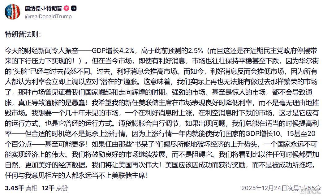 他认为,强劲GDP数据是"送给美国人民的绝佳圣诞礼物"。