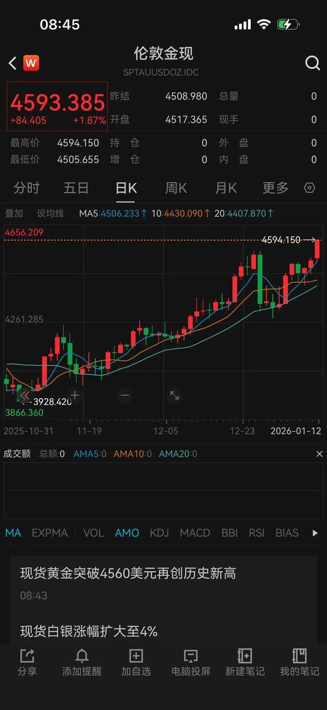 1月12日,贵金属价格狂飙。截至早上8点45分发稿时,现货黄金大涨1.87%,冲破4593美元/盎司,创出历史新高,现货白银更是涨超4.5%,站上83美元/盎司,接近于历史新高。