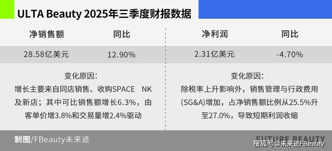 增长仍在继续,但代价也更清晰地呈现出来。根据2025财年第三季度财报,ULTA净销售额同比增长12.9%至28.6亿美元,可比销售额也实现6.3%的显著增长,表明其门店效率与消费活跃度依然强劲。