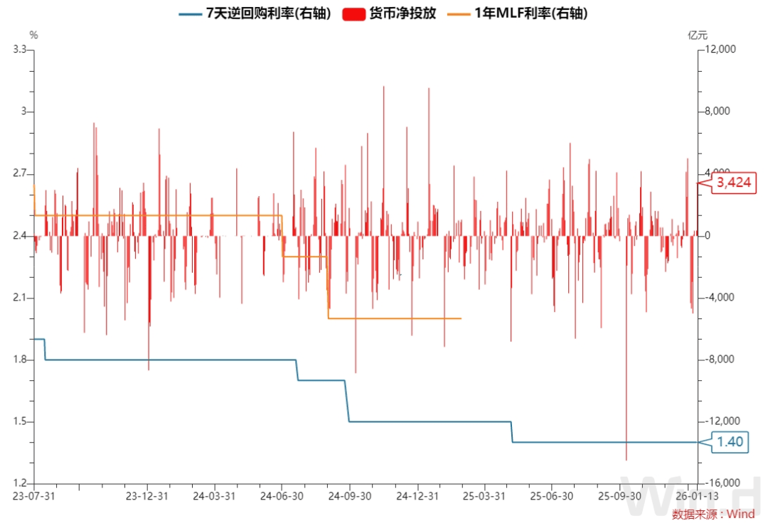 央行公告称,1月13日以固定利率、数量招标方式开展了3586亿元7天期逆回购操作,操作利率1.40%,投标量3586亿元,中标量3586亿元。Wind数据显示,当日162亿元逆回购到期,据此计算,单日净投放3424亿元。