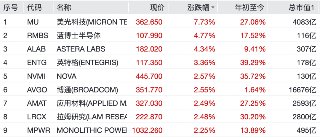 芯片股多数上涨,费城半导体指数涨1.15%, 美光科技涨超7%,博通、拉姆研究、应用材料涨逾2%。跌幅方面,英特尔跌超2%,高通跌逾1%。