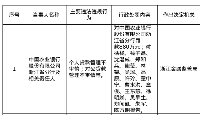 罚单显示,中国农业银行股份有限公司浙江省分行的主要违法违规事实为:个人贷款管理不审慎,对公贷款管理不审慎等。