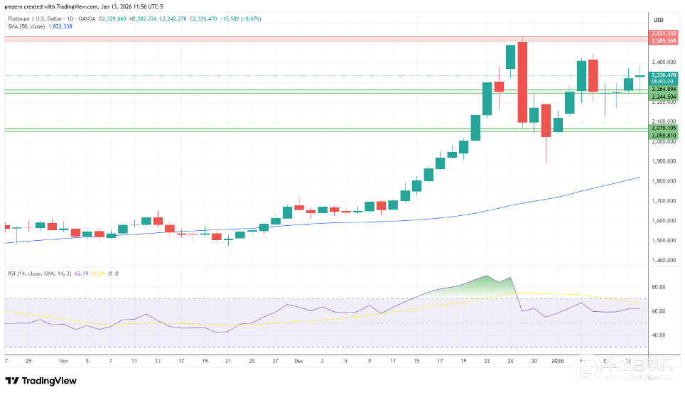 如果铂金收于2350美元上方,则将获得额外的上行动力,并向2450美元移动。