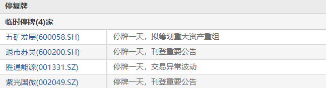 12月30日,五矿发展、退市苏吴、胜通能源、紫光国微临停,*ST东易、*ST中装、东通退复牌。