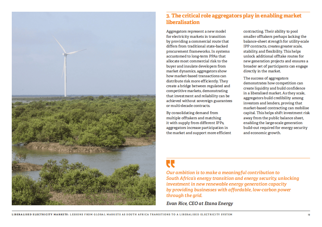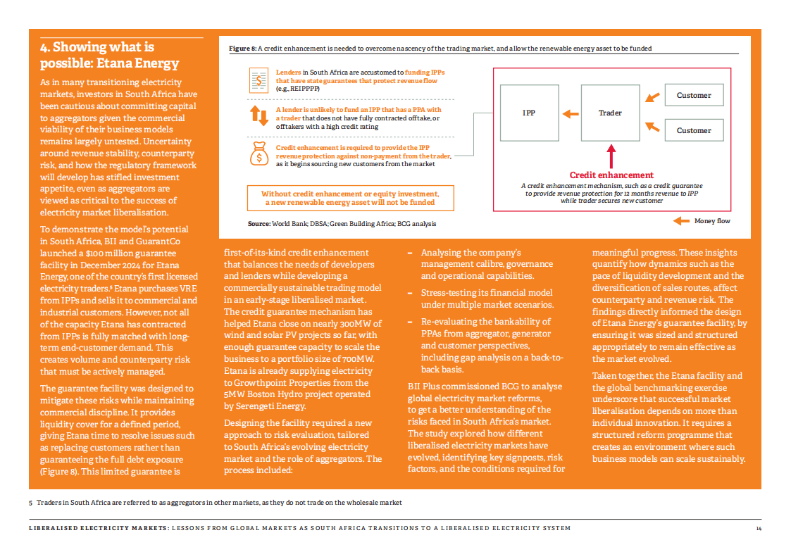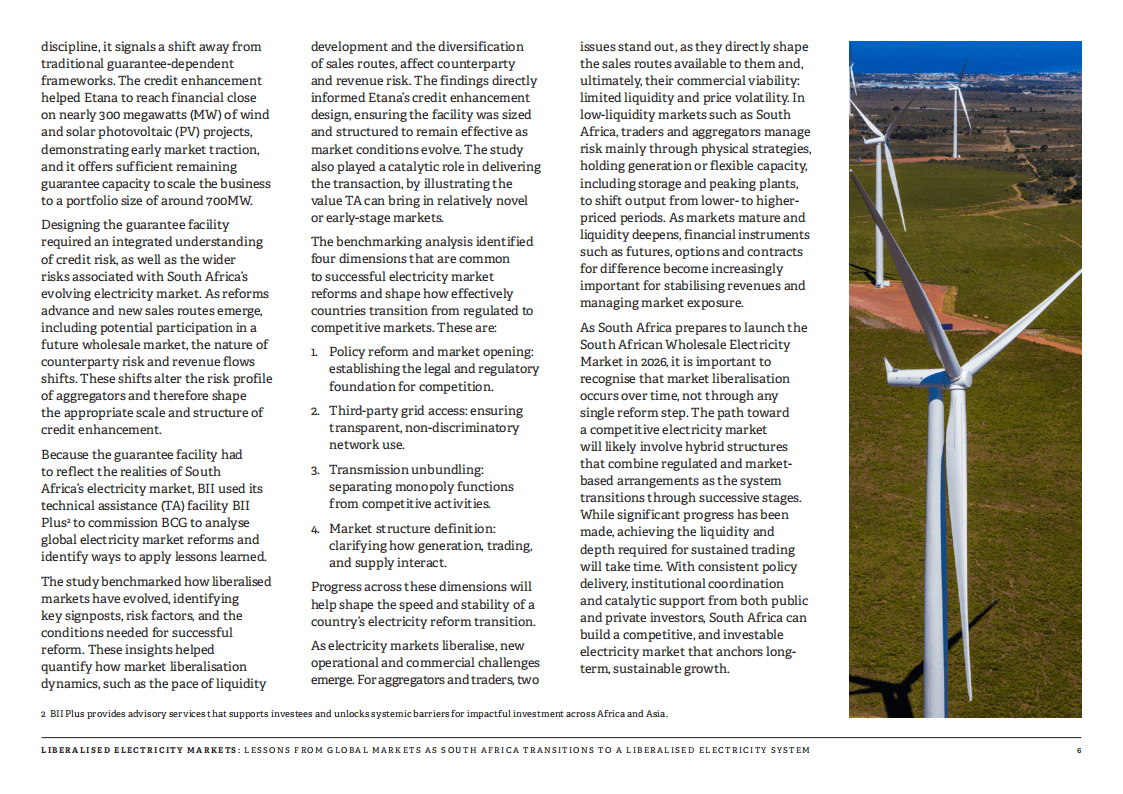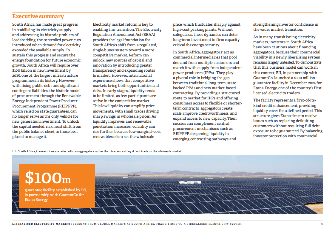 聚合商在转型中扮演关键角色,它们整合多个用户需求与独立发电商的电力供应,搭建起传统长期购电协议与市场化合约之间的桥梁,既为中小用户提供接入渠道,也为新发电项目拓展销路,助力提升市场流动性与投资者信心。Etana能源作为南非首批持牌电力交易商,借助英国国际投资公司与GuarantCo联合推出的1亿美元担保机制,已成功推进近300兆瓦风光项目落地,验证了该商业模式的可行性。