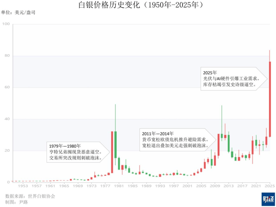 2011年4月,受国际金融危机后的量化宽松驱动,投机资金涌入,将银价推向50美元关口,但2013年—2014年,伴随美联储退出量化宽松及美元走强,大宗商品超级周期落幕,白银价格泡沫破裂并陷入长达数年的熊市;2020年,新冠疫情引发的流动性危机导致银价短暂跌至11美元左右,随即在货币宽松下反弹。