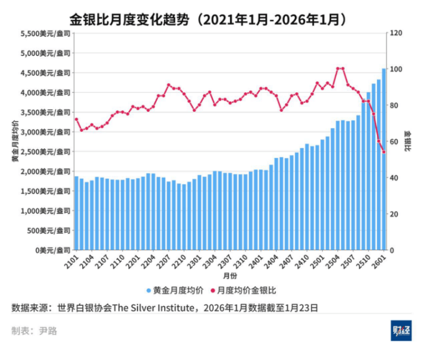 传统的贵金属分析框架中,白银跟随黄金波动,主要受利率和货币政策等宏观金融因素影响,金银价格比一直是判断白银价格的关键指标,通常波动于60倍-80倍之间,一旦跌破60,投资者就会卖出白银,买入黄金。但2026年1月23日,金银价格比跌破50。