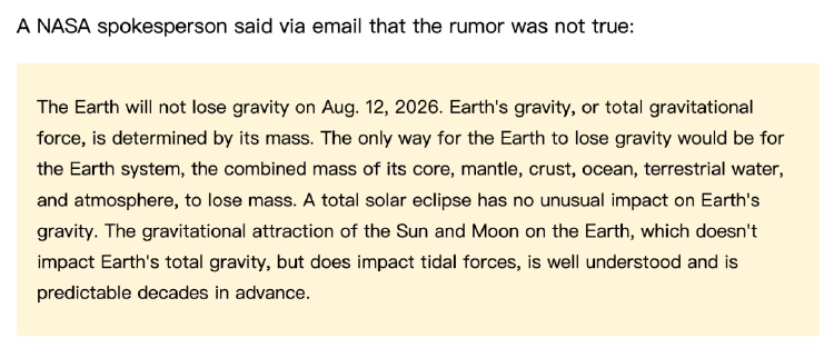 面对谣言扩散,NASA通过国际权威事实核查网站 Snopes明确表态:“地球绝不会在 2026年8月12日失去引力,这一说法毫无科学依据”。
